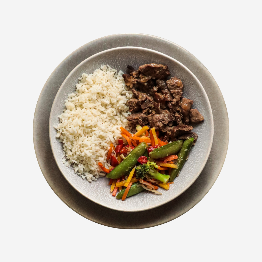 Hühnerstreifen mit Wokgemüse und Basmatireis
