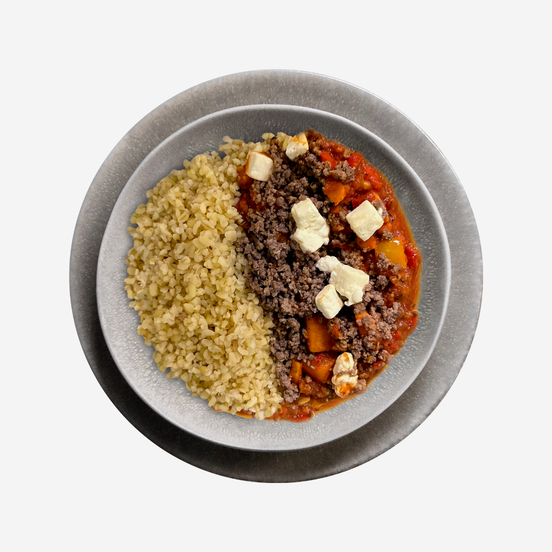 Süßkartoffelauflauf mit Feta, Rind und Bulgur